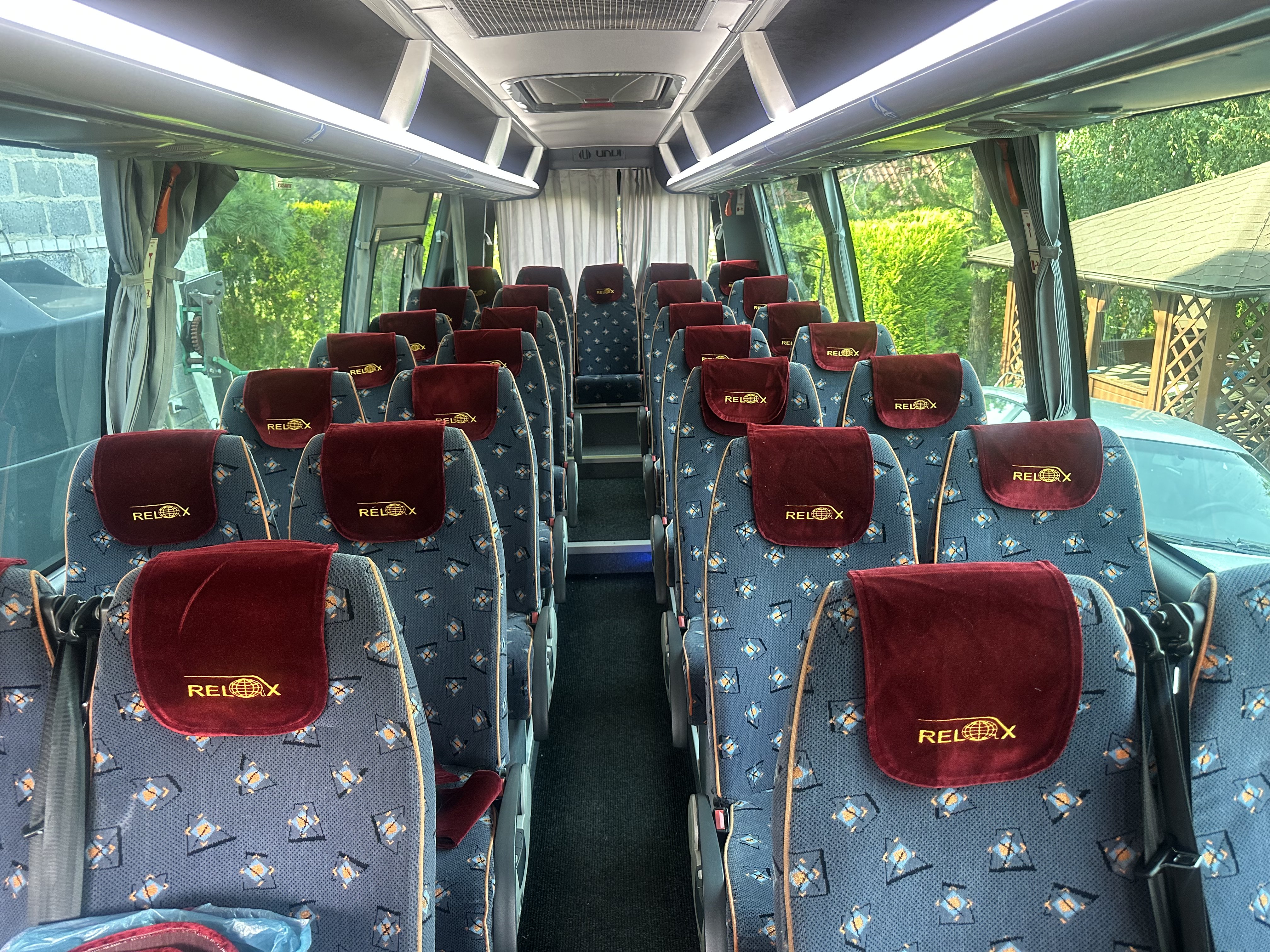 Autokar bardzo dobrze wyposażony. Posiada 29 miejsc pasażerskich, klimatyzacje, radio, cd, dvd z monitorem, lodówkę, coffee bar, szyberdach, system GPS, ABS, spełnia normę EURO 6.